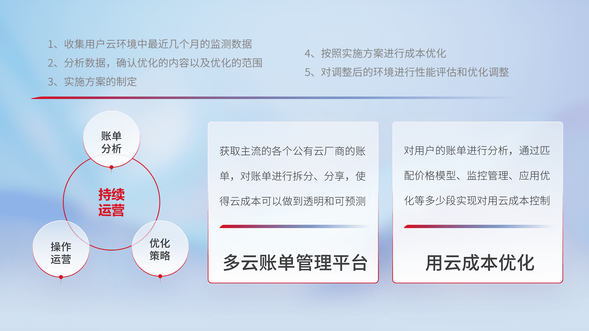 通过多云纳管,,,以统一的资源数据模型把客户的云资源进行抽象和封装,,进而实现对多云资源的统一操作,,,保障云资源管理的可靠性、、稳定性与可用性。。。。量身定制化运维内容,,,,配置、、开发运维、、补丁管理、、、备份、、监控、、、、认证和访问管理、、审计和日常巡检等,,保障在用云过程中的可靠度,,,稳定度以及高可用率。。。